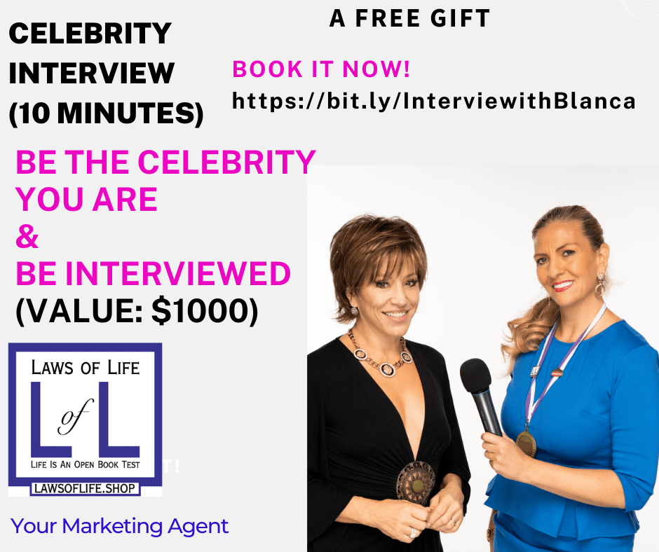 10-min INTERVIEW. You are invited to the LIVE 90-min webinar with Blanca on how to prepare for your interview and optimize it to create your digital celebrity. You receive an email critique after the interview.  Best Interview Winner receives: An Interview at  Laws of Life International Summit ($1000 Value).  Custom Background ($99) A Linktree ($99) and one license to the Self-Powered       Entrepreneur Course ($3000) –             TOTAL PACKAGE value of $4200!